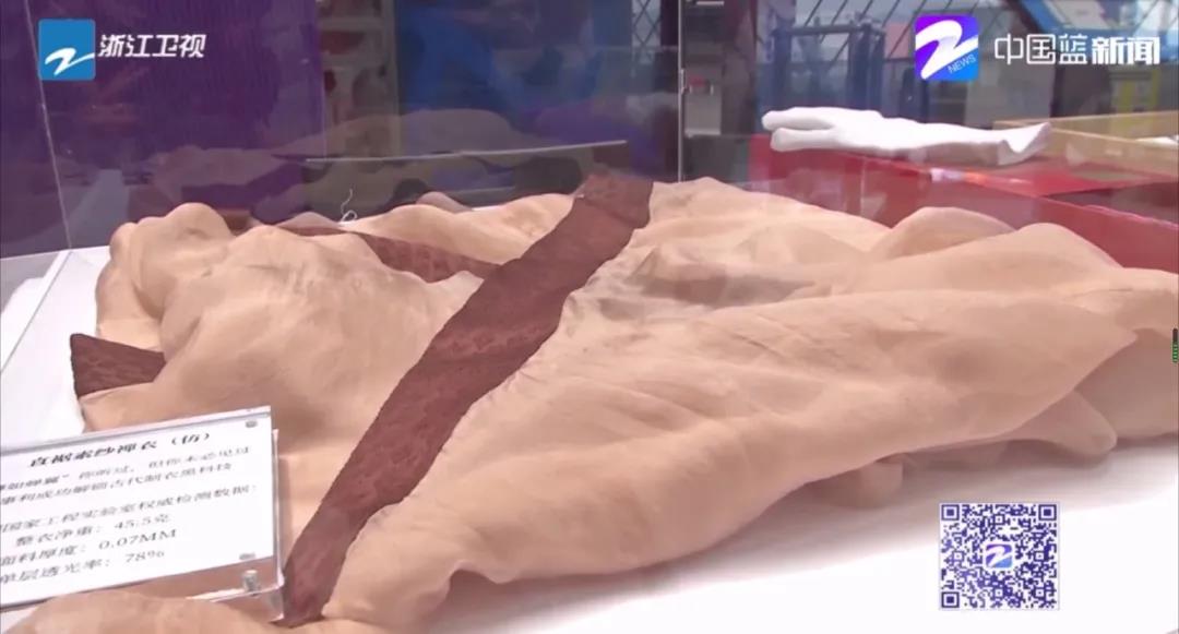 万事利丝绸历时2年在面料技术上下功夫,攻克“超薄丝织面料”技术难关,成功仿制出的 “直裾素纱襌衣”仅为45.50克,比长沙马王堆出土原件的49克还轻了约3.50克。