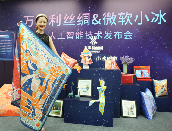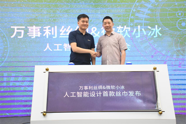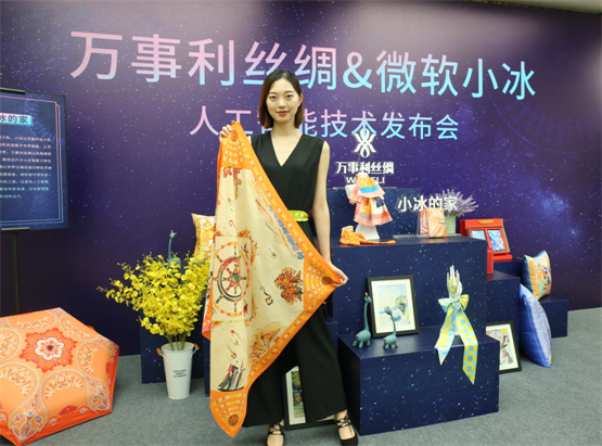 2019年9月20日,万事利丝绸X微软小冰人工智能技术发布会在杭州召开。万事利丝绸联合人工智能微软小冰,探索跨界合作新模式,共同开启一场传统美学与人工智能的时尚对话。作为全球首款人工智能丝绸系列产品的发布会,引发了众多媒体的关注。