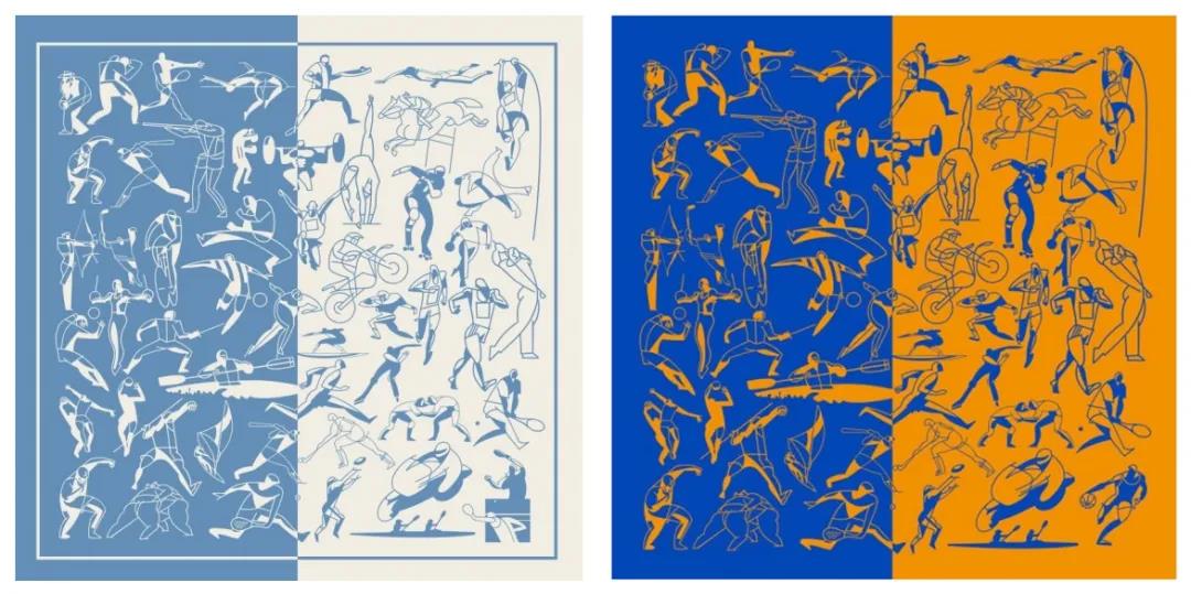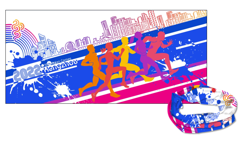 “逐梦掠影”丝巾色彩选用亚运logo的蓝色与绿色拼接,画面由一位位运动健儿的矫健身影组合而成,仿佛印证着“百舸争流,奋楫者先;千帆竞发,勇进者胜”,展现了运动健儿的追逐梦想、勇往直前的拼搏精神。