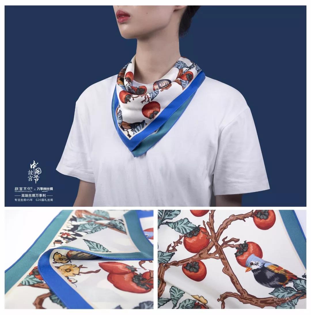 本次中秋节,万事利丝绸首次与故宫合作,联合推出“中秋万事礼”宫廷礼盒。礼盒中的“百柿如意”双面异色小方巾,是万事利丝绸以《岁朝图》为灵感设计而成。